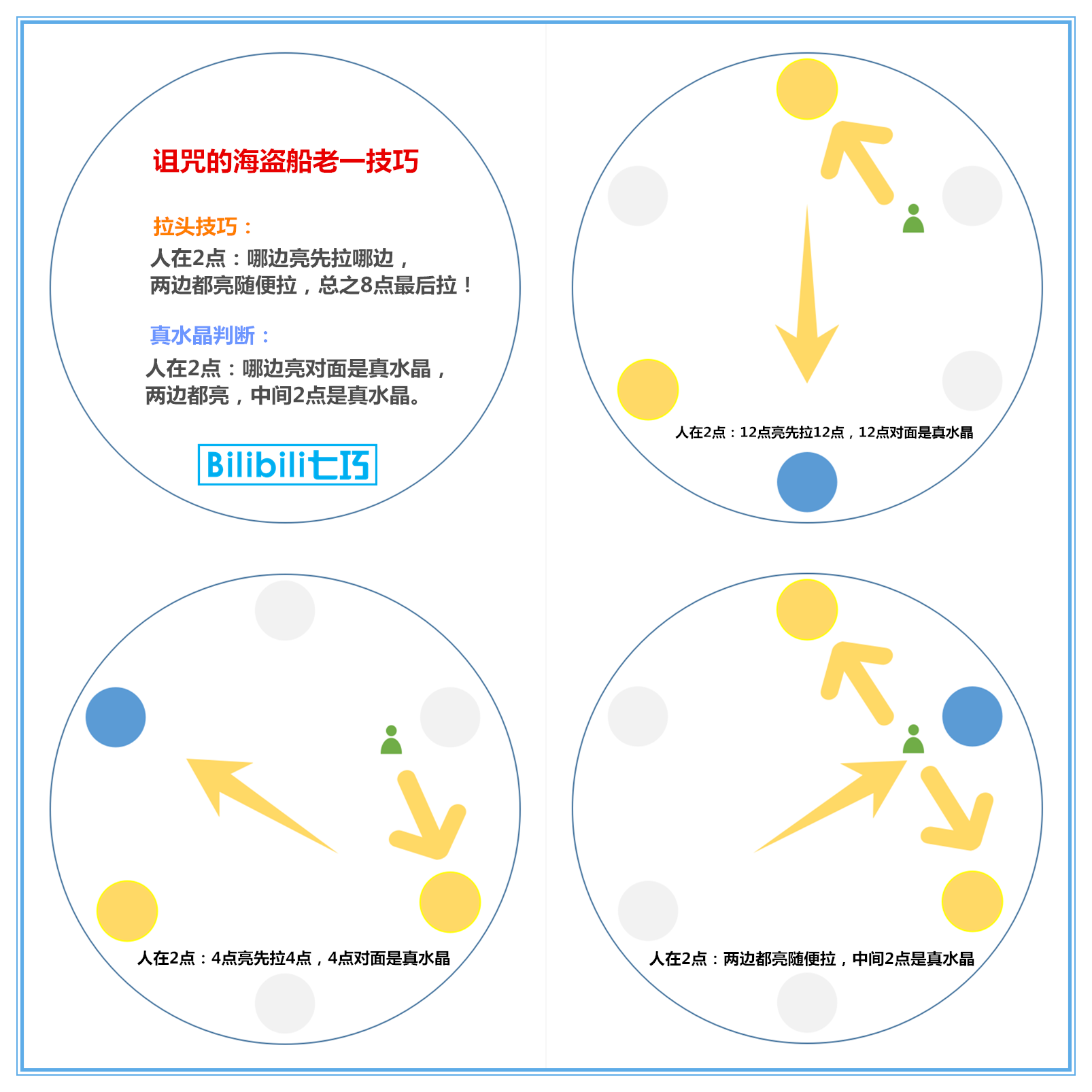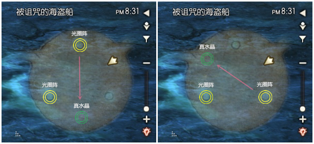 机制说明:后期每阶段需要拉两次头(方向)吸收光圈(90%-60%-30%),最近的队友拉头(主T除外); 90%-60%血量BOSS拉头只有正冲,不会反向;30%血量BOSS拉头随机正冲或者反冲; 拉完2次头(方向)吸收光圈后,可以直接判断来踩真水晶,其他队友远离,待安全罩出现后再进来(若在外面则被秒杀)。 ※技巧:海盗船老一拉头以及判断真水晶技巧