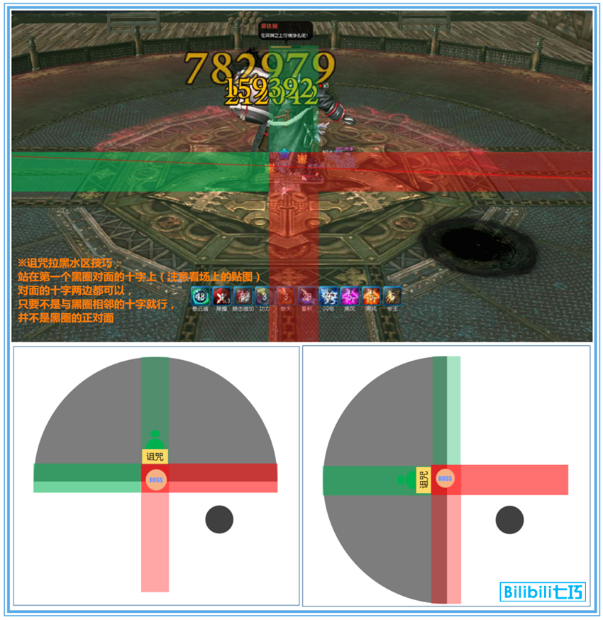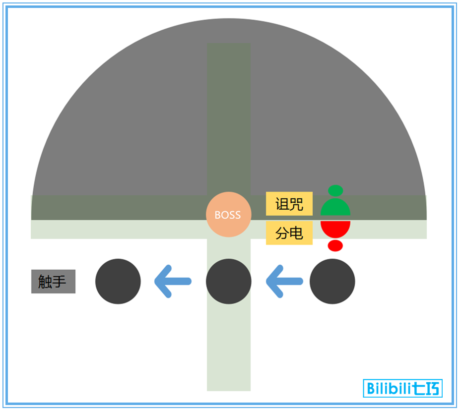 ④拉诅咒:诅咒所在区域生成180度半圆黑水,触手不能碰到黑水否则直接团灭,所以诅咒自己要站在黑圈对面,之后诅咒不可以出黑水区外; ※诅咒拉黑水区技巧:站在第一个黑圈对面的十字上(注意看场上的贴图),对面的十字两边都可以,只要不是与黑圈相邻的十字就行,并不是黑圈的正对面。 ※补充:因为黑水不能碰到黑圈,所以黑圈一侧是安全的,其他玩家不要和诅咒站一起,遇到黑水必死。