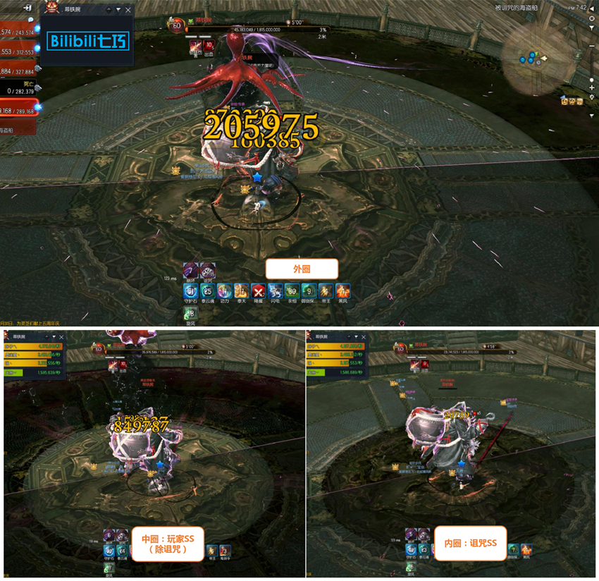 诅咒此时走到BOSS脚下即可,待割完线后,看BOSS抬手朝割线的玩家丢一枚紫色炮弹后,按SS远离把线扯断和割线玩家两人互换位置; 换位后,原诅咒需要把地上留下的黑圈踩掉。 ⑦接下来BOSS抓黑水诅咒对象,需要双控救人; ⑧BOSS再次朝诅咒玩家丢紫色炸弹,需要一名玩家靠近诅咒分电; ※注意:黑水诅咒和外面分电的玩家都靠近BOSS分电;另外,一开始拉诅咒的玩家不能靠近分电(诅咒痕BUFF后遗症),否则团灭。 ⑨接下来出现“外-中-内”环状黑圈,(除黑水诅咒外)其他所有玩家在中圈出现后正常SS躲避黑圈, ※特别注意:黑水诅咒要晚一点SS,等到内圈变黑后再SS,这样可以保证线被扯断也不会害死队友。