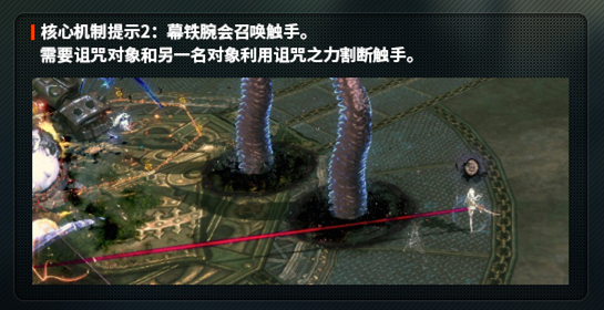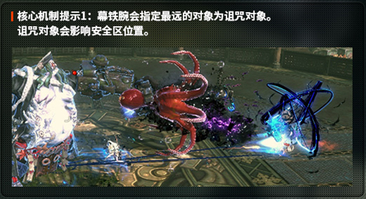 ②字幕提示“幕铁腕指定诅咒对象”,BOSS给最远的人诅咒BUFF,然后全屏吸人(召唤可以放蒲公英); ③区域随机生成一个触手黑圈,最远的人获得诅咒;