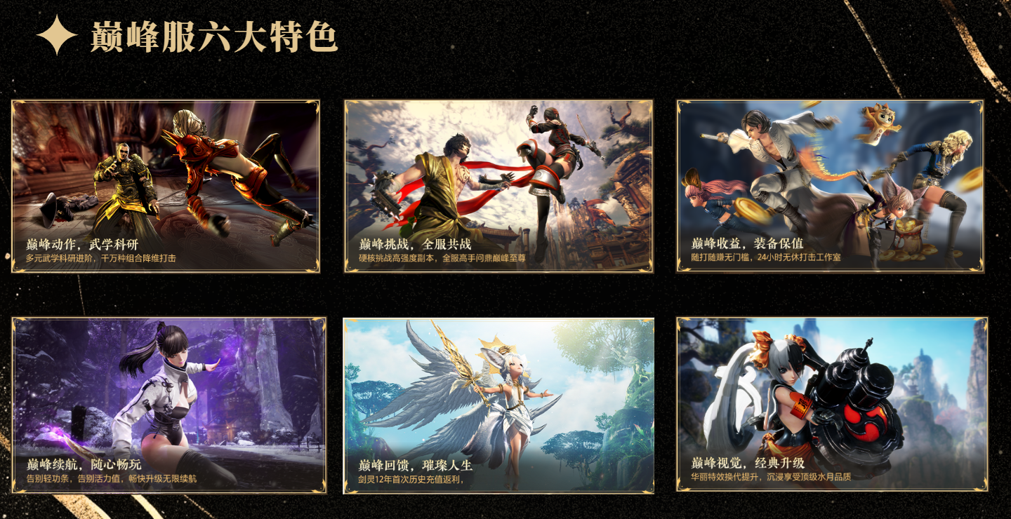 去年,我们推出了《剑灵》怀旧服,连日爆满的服务器再次见证了情怀的力量,以及大家对《剑灵》IP的喜爱。 在这之后我们多次问自己,为什么在MMO大浪淘沙的今天,《剑灵》仍旧如此让人着迷?没错,那就是刻在《剑灵》骨子里的动作基因与充满着挑战的游戏体验。 秦义绝、火炮兰...每一个Boss带来的不仅是回味无穷的剧情,更是操作感官的双重刺激,每一帧画面都喷薄着肾上腺素??,??每一次操作都震颤着神经末梢??... 正是这些让你我在《剑灵》的世界中相聚直至今日。因此,在MMO愈发繁杂的当下,我们选择回归动作MMO最纯粹的乐趣,为大家呈上这一款更适合挑战型玩家的《剑灵》——巅峰服。5.29日即将开启主播测试,现在前往官网预约即可获得风华正茂、洪门巅峰使者专属称号,还有高额Q币奖池等你来抽。报名巅峰导师团、主播带玩团或巅峰服全民创作激励活动,抢先获取专属内测资格! 巅峰服将聚焦巅峰动作、巅峰续航、巅峰回馈、巅峰视觉、巅峰挑战、巅峰收益六大“绝学”,力求带给玩家更加立体也更加纯粹的MMO体验,带你重回MMO巅峰时代!当然还有最重要的一件事,《剑灵》巅峰服的运营路线将区别于怀旧服,游戏内容、养成路线与玩法框架将与全球版本同步,这一次,我们为大家呈现的将是一个依然熟悉但又全面革新的剑灵世界! 【巅峰动作】多元武学科研进阶,千万种组合降维打击! 动作,是《剑灵》系列贯穿始终的灵魂。在《剑灵》巅峰服中,我们不仅全盘保留了系列一脉相承的“战斗爽”风格,还为大家搭建了一个更加纯粹的“技术流”舞台。 比如副本方面,巅峰服更像是一个Hardcore服务器,所有的副本玩法只设置了一种最具挑战的难度,Boss更强大、招式更硬核,你必须以手术刀般的操作拆解他们的招式,寻找机会将你的DPS拉到最大。在这里,没有侥幸可言,唯有刀尖起舞杀出重围,技术与操作是你活下去的唯一途径。 除了英雄副本,更有4人模式的高难度的传说副本,是一人犯错全队升天,还是精妙配合成功拿下,就看大家的操作了。 其次,巅峰服在个人成长方面也进行了全面升级与革新,上百种武功流派,上万种武功组合等你“科研”。在这里,你既可以成为一名每门武功绝学都掌握的“六边形战士”,也可以剑走偏锋,死磕某一种武功,成为这一流派的“领域大神”。 总之,我们拒绝公式化成长、拒绝单一的游戏体验,大家的神级操作“看得见”,你的键盘就是创世神笔,苦心钻研的武学流派有更多的展示空间。 【巅峰续航】继承水月经典,畅快升级无限续航! 要问《剑灵》漫长的发展史中哪一个版本最为经典,相信大多数人都会脱口而出“火炮兰”版本。它不仅是剑灵发展史中的明珠,更是每一位玩家心中的白月光。 经典永不褪色,《剑灵》巅峰服将以火炮兰所在的“水月版本”为基石,重现御龙林、大漠、水月平原的各个经典场景、人物与BOSS。 不仅如此,巅峰服在体验上将同步最新全球版本,不设升级活力限制,不卡等级,完成主线任务即可轻松满级。并且,大家最喜闻乐见的轻功也不再有“轻功条”的限制。我们希望让每位玩家都能尽情领略《剑灵》的独特东方美学,在这里,你可以无限续航去到任意你想去的地方,身若惊鸿跃入苍穹,真正诠释“不是所有轻功MMO都叫《剑灵》”! 【巅峰回馈】首次历史充值返还,让你重回巅峰时代! 为了让所有热爱《剑灵》的玩家都能快速融入到巅峰服的氛围中,我们为大家准备了相当丰厚的福利,每一位曾经在《剑灵》中投入真金白银的玩家均可在巅峰服中领取到1:1的额度返还(有上限额度)。 后续我们会逐渐爆料历史充值返还中的丰富内容,不要错过后续的爆料哦~ 【巅峰视觉】华丽特效换代提升,沉浸享受顶级水月品质! 巅峰服将继承《剑灵》系列一贯的革新精髓,采用与《剑灵》怀旧服同样的全新引擎精雕细琢每一个玩家熟悉的场景,并且在画面纹理、光影细节、帧数等方面进行针对优化。 水月平原如世外桃源般的秀美风景,半月湖农场随风飘舞的麦浪,大漠地图的异域风情,以及那高耸入云的情缘崖,相信大家在巅峰服中再次回看这些经典画面,也能有新的感受。 此外,巅峰服的技能特效在怀旧服的基础上进行了进一步华丽升级!旨在让大家拥有更加出色的画面体验,《剑灵》依旧是那个画面超能打的游戏。 【巅峰挑战】重温战火纷飞,全服高手问鼎巅峰至尊! 群雄逐鹿,战火重燃!《剑灵》巅峰服中我们为各路精英准备规模更大的巅峰舞台——剑灵史上首个多服务器联赛“武灵巅峰赛”。 每位玩家击杀野外BOSS、野外PK、通关副本、交易等行为等都将获得个人/服务器积分,达到一定数额即可瓜分奖励巨量好礼,所以请各位撸起袖子猛猛干,你的每一份付出在这里都能得到回报。 与此同时,怀旧服中大家喜爱的赛季制仍会在巅峰服中得到保留,并且在此之上我们为大家准备一个更有挑战空间的舞台——“巅峰名人堂”,每个服务器排名靠前的玩家将进入巅峰名人堂,获得神石分红、专属荣誉称号奖励、NPC冠名权等定制奖励和实物定制奖励! 各方势力都将汇聚于此,熊熊战火重燃,高手林立、卧虎藏龙,请秀出你的绝学踏上登神长阶,或许你的名字就将入选巅峰名人堂,刻入江湖传说! 【巅峰收益】随打随赚无门槛,24小时无休打击工作室! 付出就有回报!《剑灵》巅峰服不玩虚的,珍稀的武功秘籍和装备均可通过
