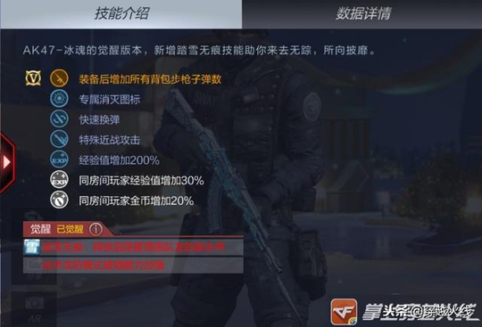 七、总结 AK47-冰魂觉醒的基础数据非常不错,射速、换弹速度、移动速度均处于英雄级AK的上游水平,所以这把枪上手给人的第一感觉就是干脆利索。它的弹道在英雄级AK中属于中等水平,不过冰魂觉醒的强势技能又给它加了很多分,在爆破模式中开启踏雪无痕技能后附近队友3秒内脚步全无,就能打敌人个措手不及,这足以决定一局的胜负。
