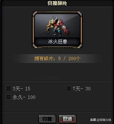 有些小伙伴可能会问:这款新的挑战武器怎么获得呢? 冰火巨兽的获得方式是完全免费的! 在游戏中可以通过碎片兑换到永久的冰火巨兽,目前在先遣服中玩家可通过刷新挑战地图来获得碎片,15碎片可以兑换3天,30碎片可以兑换7天,100碎片可以兑换永久(如图)。