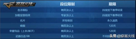 在客户端更新后,枪王排位第9赛季将进行结算,玩家们根据最高段位获得相应奖励。精英及以上段位的玩家可获得击杀图标、加载背景特效、喷图、荣耀视频(上衣/裤子)等,所有级别玩家都可获得永久名片一张。