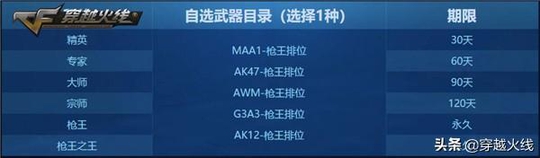 除此之外,各段位玩家还可获得自己的专属武器道具,精英段位可获得MAA1-枪王排位(30天),专家段位可获得AK47-枪王排位(60天),大师段位可获得AWM-枪王排位(90天),宗师段位可拥有120天的G3A3-枪王排位,枪王和枪王之王可获得AK12-枪王排位(永久),自选武器助力玩家越战越勇。
