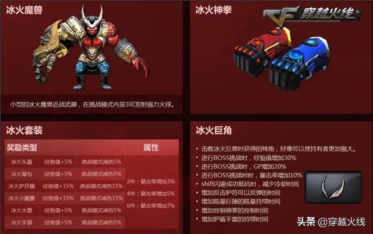 挑战模式通关奖励也十分丰厚,有小型的冰火魔兽近战武器,可在挑战模式内按3发射强力火球;冰火神拳、和冰火套装为玩家提供额外经验值、挑战减伤和暴击几率。击败冰火巨兽时可获得冰火巨角,使持有者更加强大,是挑战之路上又一必不可少的神器!