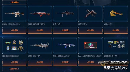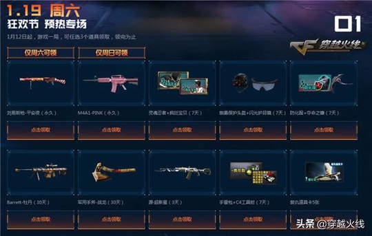 周六狂欢M4A1-十年火线轻易领 1月19日当天,玩家进行游戏1局,即可进入活动页面领取任选下列5个极品武器道具选择领取。而如果错过了周六当天,各位玩家则只能选择在1月20日到2月1日期间进行游戏一局,累计游戏3天后再来此页面领取5个。可减伤60%的终极泰坦6件套(30天)与十周年系列最后一件M4A1-十年火线(永久)仅需游戏一局即可领取!