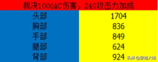 当僵尸去掉防弹头盔和防弹衣后,只有1000AC时,通过表格就可以看出,裁决的伤害降低了很多,除了头部1704之外,其余的部位均是1000以下的伤害, 看来裁决对防弹头盔和防弹衣的破甲伤害是真的高,而对防化服的破甲伤害就不怎么高了。另外不仅是裁决有破甲伤害,其它的武器也有,只不过没有裁决这么明显罢了 。