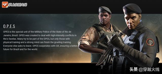 精英部队(外服名称O.P.E.S)是我们国服引进的第二个男性外服角色。 介绍比较简单: "O.P.E.S作为巴西里约热内卢市军警下属的特工队,由于他们主要活跃区域"棚户区"的高犯罪率,使他们锻炼成为了具备他人望尘莫及的经验和熟练度的精英部队。"