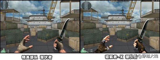 从上面的对比我们可以看得出来,精英部队保卫者的第一人称视角,手部是全密封型的作战手套,这与我们其他大多数男性角色差不多,并没有什么特别之处。而从潜伏者的第一人称视角来看,感觉手指较为纤细,而且手套背部也有绣纹的图案,这点与猎狐者-X比较相似。