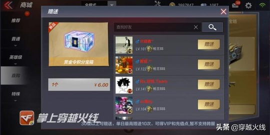 宝箱赠送功能开启 最最关键的是赏金令宝箱可以赠送哦 ,如果你想赠送给相应的好友,可以直接点击赠送,然后选择相应的好友即可, 赠送的要求是等级在30级以上,一天只能赠送10次,还可以获得VIP和充值点 ,小伙伴们可以选择关系好的好友赠送哦,不过暂时不支持跨服哦!