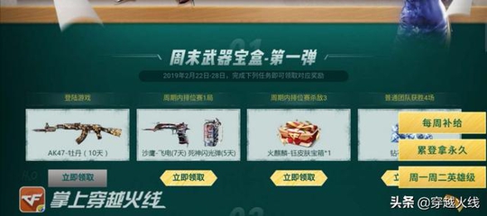周末武器宝盒 第一弹 小伙伴们在2.22-2.28期间完成相应的任务即可领取奖励,任务也是比较简单的,小伙伴们只要 参与一局排位赛并且杀敌3个 ,就可以 领取前三个奖励 ,其中还有 火麒麟-钰皮肤宝箱 ,欧皇的小伙伴没准就开出永久啦! 在活动期间完成4局普通团队,即可获得28-66钻石,普通团队建议打小图 ,时间快还特别省力!