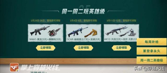 玩英雄级 小伙伴们还可以在指定时间领取相应的期限英雄级武器,这里的武器都是登录即可领取的,小伙伴们千万不要错过呀,每周的任务也是超级简单的,小伙伴们可以轻松完成!