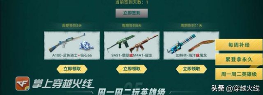 登录领永久武器 小伙伴们别忘记每天点击签到哦!只要累计达到一定天数,我们就可以获得永久武器的奖励,周期签到5天可获得 A180-蓝色骑士+钻石66 、 周期签到8天即可获得9A91-翡翠或M4A1-耀龙 ,周期签到11天即可获得 加特林-海洋或屠龙, 是时候展示我们欧皇的运气啦!以上武器均是永久,但是有一定几率获得其中一个!