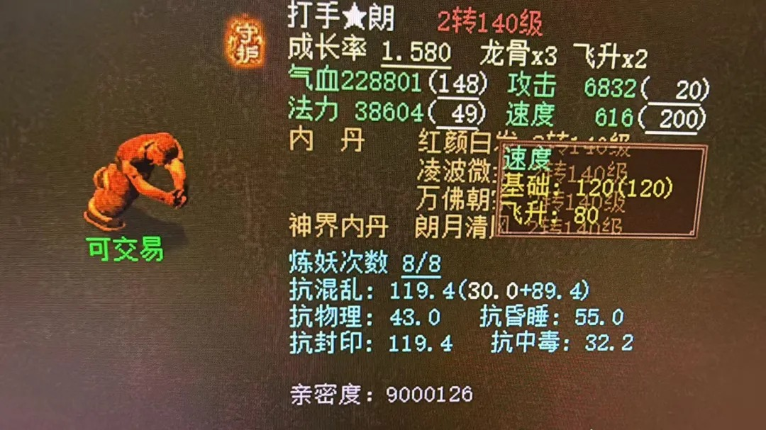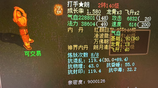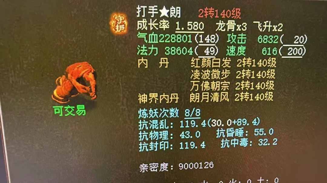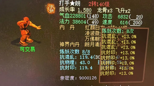 140级最强黄巾力士,毫无瑕疵,敏、血全满,龙骨全部爆在根骨上,配140级内丹,打13炼妖,900w亲密,冰混抗性高达119.4,黄巾力士的天花板。(素材提供:茂川) 2转140级22w血,616速度 根骨满初值,龙骨全爆在根骨上 速度初值满 8个冰混13炼妖 编辑:月光下完美