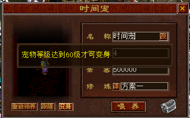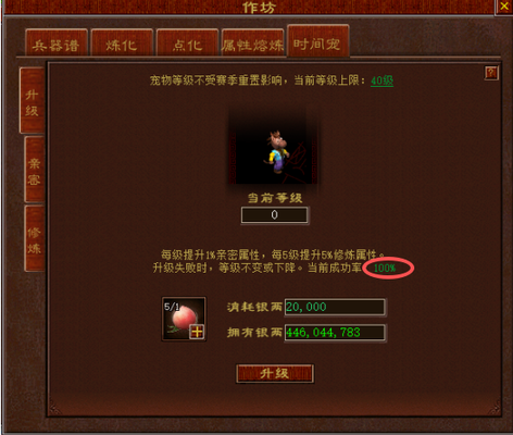 时间宠界面功能详解时间宠界面分为【升级】、【亲密】、【修炼】三个选项,每个选项都对应着不同的道具消耗与属性提升方式。 升级界面 在【升级】界面,玩家需要使用道具“宠物灵桃”来提升时间宠的等级。每提升一级,时间宠的亲密属性会增加1%,每提升5级,修炼属性则会增加5%。不过,时间宠在食用宠物灵桃时,并非每次都能成功升级,存在升级失败的情况。失败时,时间宠的等级可能保持不变,甚至会有所下降。时间宠 每5级为一循环 ,升级成功的概率 为 100%/100%/60%/40%/30% , 同时 界面也会给出相应的提示,让玩家心中有数。