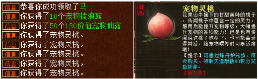 · 天道酬勤积分 :玩家每天天道酬勤积分达到90分,即可领取1个“宠物灵桃”。