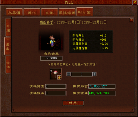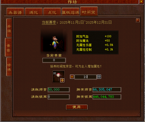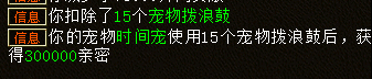 亲密界面 【亲密】界面需要消耗道具“宠物拨浪鼓”来增加亲密度。随着亲密度的不断增长,时间宠的附加气血、附加魔法、无属性伤害、无属性控制这四个数值也会相应提升。每个“宠物拨浪鼓”能够为时间宠提供2万点亲密度。
