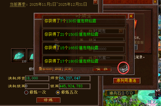 天道酬勤积分在获取“宠物仙露”方面同样发挥着重要作用。每获得30积分,玩家可以在时间宠界面领取20个“宠物仙露”。比如获得120积分,就能领取80个;若获得114积分,不足120,则只能领取 60 个。