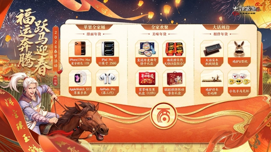 春节活动“福运奔腾 跃马迎春”也于今日全服上线, 苹果全家桶 、 春节活动凭证 、 情怀人形神兽至尊宝 等你来拿!