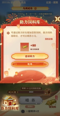 获得助力饲料后,可前往助力饲料库取用,当助力饲料库为空或负数时,将无法取出,请少侠多多助力分享哟