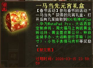 该礼盒将在元宵活动期间(3月2日12点后)开启抽奖, 万元电脑、华为平板、黄金转运珠、大话定制麻将 等实物大奖,以及 龙之骨、筋骨提气丸、神兵玄玉 等道具好礼等你来抽!
