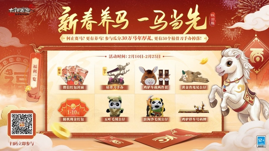 新春驯马王,马上领福饷!“一马当先”H5福利活动于 今日(2月10日) 火热开启,少侠不仅可以体验养成马匹的快乐,还能解锁 限量红包封面、随机现金红包、限量50个枯骨刀手办 , 累计30万马年厚礼 等你来赢!