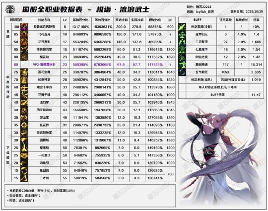 首先说明一下,国服有可能做数据调整,但是我认为不会像韩服这样针对技能单独做调整,而是直接调整角色整体数值。所以哪怕有国服特色改动,也不会影响加点方案。如果你实战需要打满或者接近打满一个太阳,则参考续航向加点。如果实战基本一套带走则参考爆发向加点续航轴我是采取40s作为参考。因为40s只是作为一个参考,所以有部分技能可能需要43s才能出第二个,它的伤害可以做到远高于其他技能,那么我仍然会考虑在续航加点中选择它。超出43s的技能在国服环境下意义不大,不叫续航叫刮痧。技能的倾泻速度,是否脱手,命中率和范围,都会影响我对他的判断。所以加点方案,我会先分享各个技能在40s左右的数据排行,再分享具体的取舍,如果有特殊情况则会在第二步作说明数据来源:礁石22222 图表汇总来源:八爪鱼fishly感谢大佬的分享 续航环境数据排行樱花劫 1357.1w95 990w大十字 872.2w巴掌 862.4w碎岩 800w圆舞斩 791w游龙 782w爆剑 779w莲花 772w乱花 732w花舞 692w即便是续航下,那些cd比游龙 碎岩要短的也完全不值得点,实战空转太严重。实际取舍和分析首先,花舞肯定是不点了,数据表现上他最拉。然后就是争议点,乱花和圆舞斩。在黄金乡的加持下,其实圆舞斩的抓取范围还是可以接受的,大半个屏幕,出伤速度和乱花葬差不多。能接受塞蛋的情况下可以舍弃乱花葬去点圆舞斩。 能接受圆舞斩的,就30以上除了乱花葬 花舞全部点满。vp选择游龙2,湮烈掌1,大十字1/2看自己喜欢,莲花1,樱花劫2不能接受圆舞斩的,30以上除了圆舞斩 花舞全部点满。vp选择乱花葬1,湮烈掌1,大十字1/2看自己喜欢,莲花1,樱花劫2突破选择 樱花劫 大十字 巴掌国服特色和特殊贴膜选:80樱花劫 (来源:colg) ![]() 编辑:月光下完美