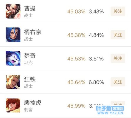 在接近胜率最低的英雄里面,曹操梦奇是一直都比较低的,而橘右京这次得到了一个优化,虽然可以连续释放1技能,但2技能的眩晕变低,可能很多人都不太适应这种打法,目前胜率还是偏低。