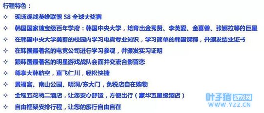 据了解,本次考察交流活动由中国服务贸易协会数字娱乐专业委员会主办,2018年10月31日-11月5日在2018英雄联盟全球总决赛决赛阶段比赛同期,赴韩国仁川市进行考察学习,考察团人员规模限定为30人。 活动主要内容包括:1、观摩英雄联盟S8世界总决赛;2、考察韩国中央人民大学电子竞技专业;3、赴韩国电子竞技行业协会交流;4、考察世界知名游戏公司韩国蓝洞游戏公司;5、参观韩国最著名的电竞公司CJ公司等。