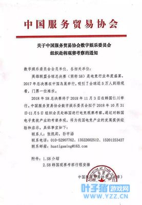 有着“电竞世界杯”之称的2018英雄联盟全球总决赛(简称S8)目前正在韩国首尔如火如荼进行中。从10月1日至11月3日,S8将有来自全球范围内的24支顶尖职业战队共同向总冠军发起冲击。作为世界上影响力最大的电子竞技盛会,去年在北京鸟巢举办的2017英雄联盟全球总决赛吸引了全球近5万人到现场观赛,火爆程度可见一斑。 2018英雄联盟全球总决赛激战正酣之际,为促进中外行业交流,推动中国数字娱乐行业发展,中国服务贸易协会数字娱乐专业委员会决定举办赴韩考察交流活动,邀请电竞行业有识之士亲赴韩国,见证2018英雄联盟全球总决赛盛况的同时,深入观察学习韩国发达的电竞产业。