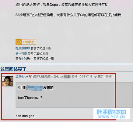 今天,路人王Dopa也是以个人的身份来到了虎扑做客,并且现场回答网友的问题。其中点亮最高的就是这名网友“ban不banxiazi?”的问题了,而Dopa“ban dan gao”的回答也是让我们相当的惊喜,原来Dopa也能顺利接上网友的梗,而且时隔了三四年,没想到Dopa还能记住这一幕,看来当年蛋糕给他的印象有多么的深刻。