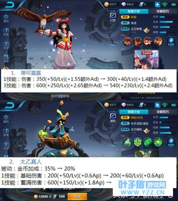 其次王者荣耀体验服对2名英雄做了平衡调整,娜可露露1技能与3技能伤害削弱,太乙真人刷钱流盛行,天美注意到了,直接削弱太乙真的被动金币加成,1技能伤害微加强。