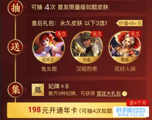 限量首发活动有一个条件,就是开通年费腾讯视频,可以得到4次抽取新皮肤“如懿”的机会,但并不是100%可以获得,所以不建议小伙伴们花费1980点券来换取抽奖机会!