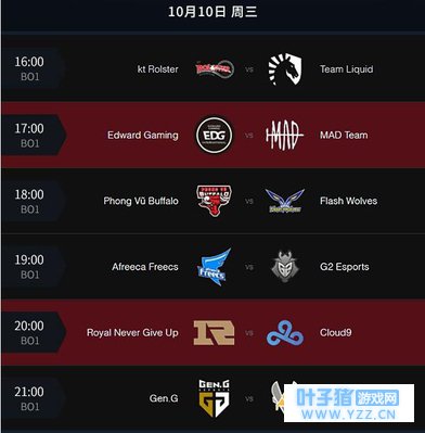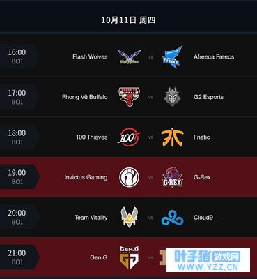 第一天 10月11日:第二天 16:00 FW-VS-AFS 17:00 PVB-VS-G2 18:00 100-VS-FNC 19:00 IG-VS-GRX 20:00 VIT-VS-C9 21:00 Gen.G-VS-RNG