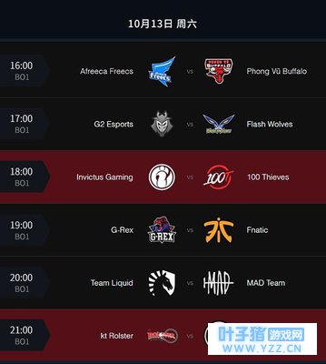 第三天 10月13日:第四天 16:00 AFS-VS-PVB 17:00 G2-VS-FW 18:00 IG-VS-100 19:00 GRX-VS-FNC 20:00 TL-VS-MAD 21:00 KT-VS-EDG