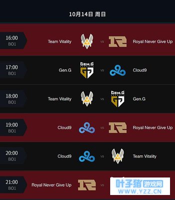 第四天 10月14日:第五天 16:00 VIT-VS-RNG 17:00 Gen.G-VS-C9 18:00 VIT-VS-Gen.G 19:00 C9-VS-RNG 20:00 C9-VS-VIT 21:00 RNG-VS-Gen.G