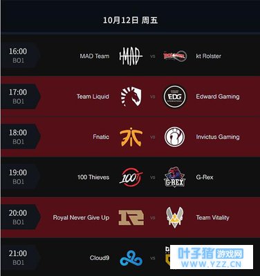 第二天 10月12日:第三天 16:00 MAD-VS-KT 17:00 TL-VS-EDG 18:00 FNC-VS-IG 19:00 100-VS-GRX 20:00 RNG-VS-VIT 21:00 C9-VS-Gen.G