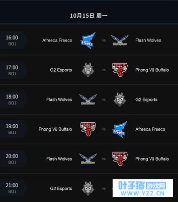 第五天 10月15日:第六天 16:00 AFS-VS-FW 17:00 G2-VS-PVB 18:00 FW-VS-G2 19:00 PVB-VS-AFS 20:00 FW-VS-PVB 21:00 G2-VS-AFS
