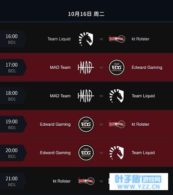 第六天 10月16日:第七天 16:00 TL-VS-KT 17:00 MAD-VS-EDG 18:00 MAD-VS-TL 19:00 EDG-VS-KT 20:00 EDG-VS-TL 21:00 KT-VS-MAD
