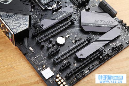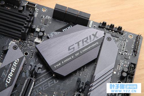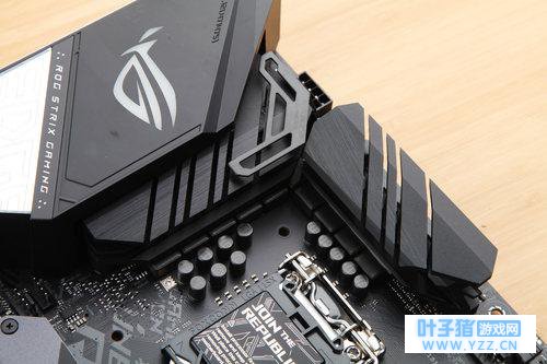 PCH装甲采用了多边形设计,与下侧的M.2接口上的装甲使用了相同的全金属材质,灰黑色的表面采用了拉丝工艺,STRIX铭牌对比前代产品更大,有着更为明显的家族式设计风格,同时在散热方面有着更为出色的表现。