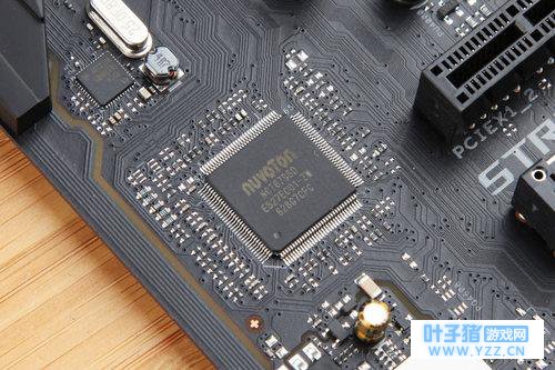 PCIe接口左侧的黑色芯片则是I/O面板芯片,来自NUVOTON,型号为NCT6798D。 灯光系统:AURA神光同步 作为华硕旗下的面向电竞市场的主力产品,RGB光效是绝对不能缺席的,在I/O装甲面板上的巨大“败家之眼”就成为了这块主板上最为炫目的存在。