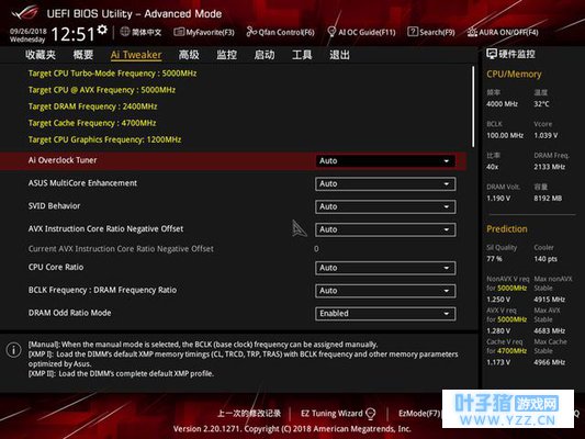 Z390-E主板上也可以进行超频操作,在AI Tweaker界面中,用户可以自行设置超频的选项,其中包含有CPU及内存等相关设置。