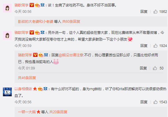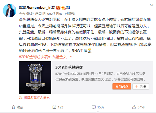 昨天是B组小组赛出线之争的比赛,解说记得就昨天负责后面几场的最后一场的情况说道: 首先跟所有人说声对不起,在上海入围赛几天就有点小感冒,来韩国尽可能在酒店里睡觉。今天上场前觉得身体状况还可以,但第五局输了以后可能是压力大,头就剧痛。最后一场后面身体真的有点顶不住,最后一波团真的不知道怎么赢的,只知道自己心跳快跟不上了。身体状况不能当作借口,是我自己的问题。最后真的谢谢RNG,不敢说在过程中没有想像你们会输,但当我还在想你们怎么赢的时候你们已经用一波团赢了,RNG牛逼