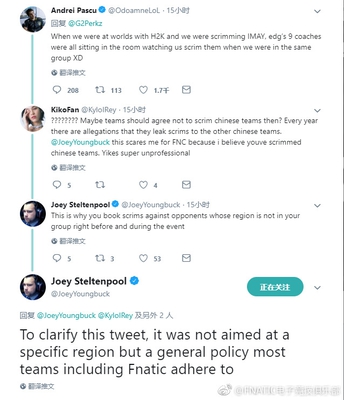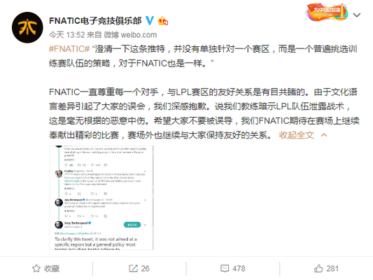 因为G2中单两条充满臆测和随意毁谤的推特,西方观众和LPL观众都陷入了巨大的争论中。Fnatic教练发表的“这就是为什么比赛前不要和组内对手同赛区的战队约训练赛的原因。”这条推特在国内同样引起了争议。 因为S7和MSI与中国观众建立了良好关系的Fnatic官博今日针对这条推特发表了正式声明: “澄清一下这条推特,并没有单独针对一个赛区,而是一个普遍挑选训练赛队伍的策略,对于FNATIC也是一样。”FNATIC一直尊重每一个对手,与LPL赛区的友好关系是有目共睹的。由于文化语言差异引起了大家的误会,我们深感抱歉。说我们教练暗示LPL队伍泄露战术,这是毫无根据的恶意中伤。希望大家不要被误导,我们FNATIC期待在赛场上继续奉献出精彩的比赛,赛场外也继续与大家保持友好的关系。