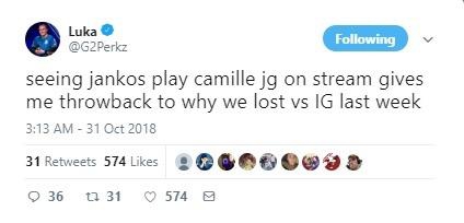 之前他公开吐槽上单wunder不尊重theshy,昨日他又发twitter吐槽打野jankos的青钢影并表示:终于知道我们为什么输给IG了!