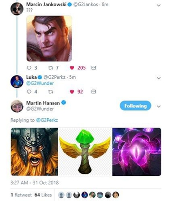打野jankos的意思就是:你问上单wunder为什么被杰斯打爆。 接下来有趣的是perkz艾特了上单wunder,wunder也是个狠角色:直接配了一个奥拉夫、眼、大眼三个图标(背景是在突围赛G2打越南PVB的时候,G2打野jankos奥拉夫为了排中路一个眼,被PVB中单大眼一个满大大死,十分尴尬),意在调侃打野jankos。