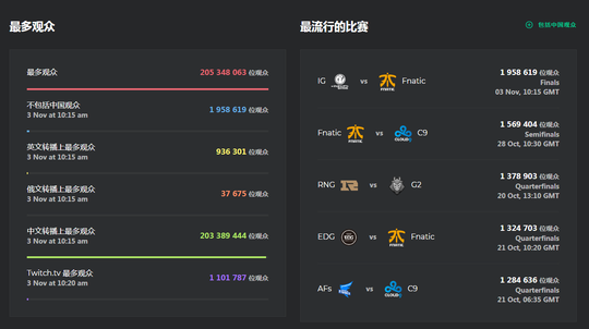 3.决赛最高收看人数突破两亿 再创电竞新高 根据外国直播数据网站Esports Stats的统计,于昨晚进行的2018年英雄联盟全球总决赛冠军战IG对战FNC的比赛吸引了超过2亿人次收看,再次打破记录成为电子竞技史上最高收看人数的比赛。 但因为中国内地直播平台的人数统计真实性难以估计,所以网站也提供了不包括中国观众的数据,昨天决赛不包括中国观众的最高收看人数达到了195万人次,相比去年国外人气最高的比赛S7决赛SKT对SSG的比赛最高收看人数202万人次略微有所下降。但英文流直播的收看人数相比去年决赛增加了10万人次。