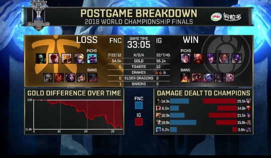 在总决赛的首局比赛中,双方在BP阶段都展现了和此前比赛中完全不同的理解,在BAN人阶段大家都不约而同的选择针对对手在本届世界赛中最擅长的英雄以及体系,IG吸取了小组赛负于FNC的经验,限制了Rekkles能够带动前期推塔节奏的英雄,最终双方阵容成型,Rekkles被迫拿到偏功能性的ADC烬,完全押宝于上中野在前期带动节奏,IG的阵容则是相对平均,没有选择三核阵容,而是拿出了偏稳的上单塞恩。在这局比赛中,双方前期节奏相对较慢,双方都想围绕上中两路做事情,反而导致了这场比赛前期节奏相对比较平稳,谁都没有取得人头,在这种发育的情况下,IG的阵容更加有利,随后双方的保卫战围绕中路展开,最终中野2v2中由IG取胜,获得了中路的优势, 在这局比赛中Caps太急于建立优势,帮助队伍逆转团战局势,反而被IG抓住了这种心理,成为全场比赛的针对点。 MVP:Rookie