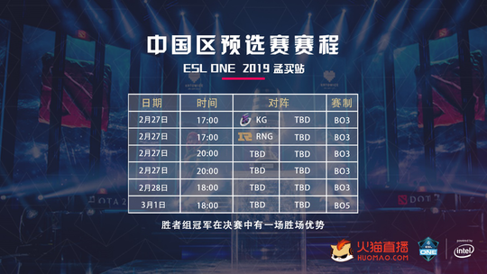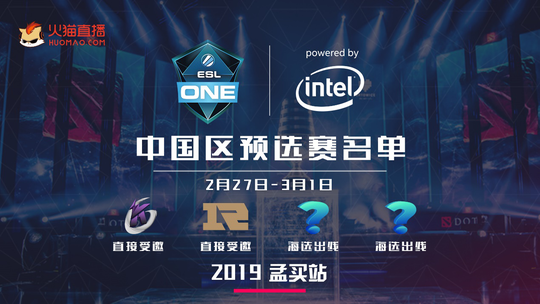 由火猫全程承办的DOTA2 ESL One孟买站中国区海选赛将于1月30日晚18:00正式开始,同时我们也很高兴的宣布:KG和RNG战队将受邀参加于2月27日至3月1日进行的ESL One孟买站中国区预选赛的比赛,与两支海选晋级战队共同争夺ESL One孟买站参赛资格。欢迎锁定火猫直播收看精彩ESL One系列赛事!
